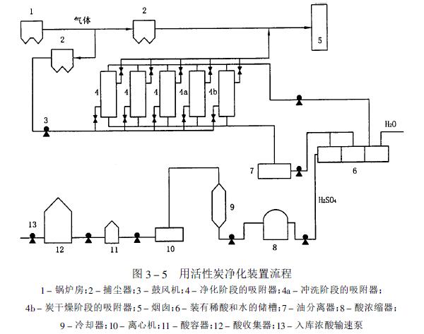 图3-5示出了日立法过程的工艺流程。从锅炉1出来的废气,在进入烟囱5之前,先通过捕尘器2和几个并联的活性炭吸附器4,借助鼓风机3克服吸附剂柱的流体阻力(近似660Pa或500mmH2O)。