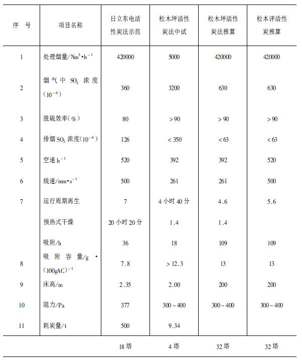 净化能力为15万m3/h净化装置,可供功率55MW发电机组的排出气体的净化之用。该机组用硫含量为1.8%的重油燃烧发电。净化装置由高11.2m和直径为5m的5个吸附器组成。各阶段的大概时间如下;净化时间为30h,冲洗20h,干燥10h。为了能说明松木坪试验效果,我们将其和日本的日立东电活性炭法流程的比较,见表3-6。