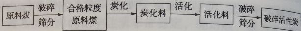 原煤破碎活性炭生产工艺是煤基活性炭生产中较为简单的一种生产工艺,具有生产成本较低,设备投资较少的优点。该工艺以合格粒度原料煤为原料,直接通过炭化、活化生产得到破碎状、不定型颗粒活性炭,其生产工艺流程见图1-5。