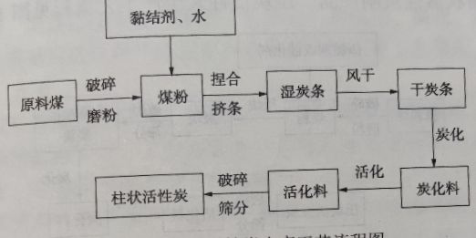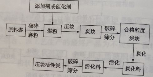 与原煤破碎活性炭生产工艺不同,成型活性炭生产工艺需要先通过成型造粒,将原料煤制成一定的形状再进行生产,柱状活性炭生产工艺即是如此。