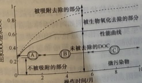 在粒状活性炭过滤器中利用生物法去除溶解有机物可以使处理后的水质具有许多优点,例如,生物活性可以去除大量的溶解有机碳(DOC)。利用吸附和生物活性去除溶解有机碳的理论表述如图1所示。首先,大部分的去除过程发生在物理吸附阶段(阶段A),而此时细菌正处于适应环境阶段,此阶段可去除40%~90%的溶解有机碳,而其他10%~20%的溶解有机碳不被粒状活性炭所吸附;在阶段B,吸附和生物降解工艺同时进行,此时细菌已适应了环境,由于吸附点的饱和,吸附能力逐渐下降;阶段C被称为稳定状态阶段,生物氧化在去除溶解有机碳过程中起主要作用,而大部分吸附能力在此阶段已耗竭,在稳定状态下,溶解有机碳的去除率在15%~40%之间。如果在稳定状态下去除效果能满足处理要求,粒状活性炭的寿命会大大延长。