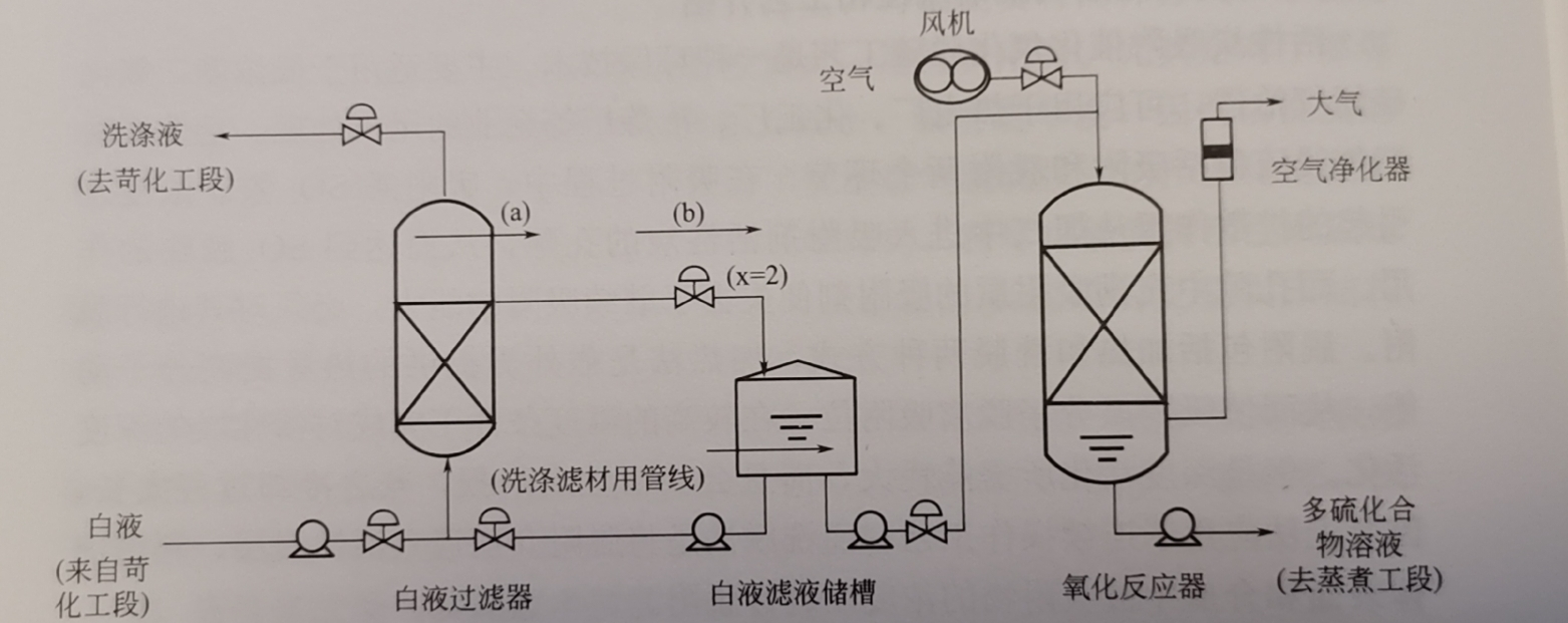 白液氧化工艺是把白液中的硫化钠氧化生成多硫化合物的工艺,其工艺流程如图7-3所示。白液在过滤器中除去所含有的以碳酸钙为主要成分的SS(悬浊固体物质)以后,进入反应器,用活性炭作催化剂(以下简称催化剂),经过空气氧化,生成多硫化合物。反应以后,在反应器下部进行气液分离,多硫化合物蒸煮液经缓冲槽供给蒸煮工艺。另一方面,空气在除雾器中除去碱雾以后,排入大气中。含有多硫化合物的蒸煮液呈赤橙色,因此也叫做橙液。