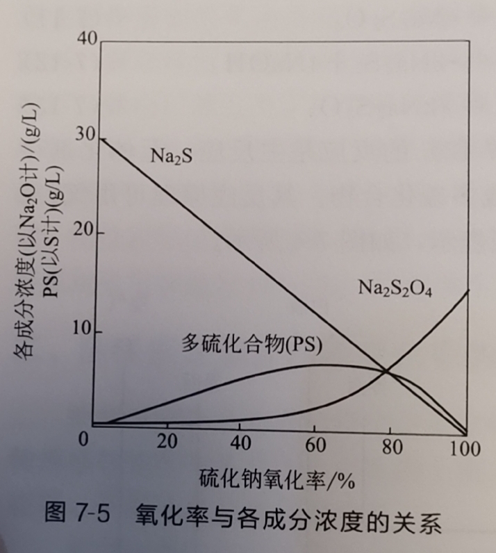 图7-5所示的是硫化钠的氧化率与各成分浓度之间的关系。为了抑制硫代硫酸钠的生成,进而提高蒸煮中有效多硫化合物的浓度,必 须把硫化钠的氧化率控制在50%~70%之间。氧化率作为液体的空间速度(LHSV)、气液比(G/L)以及反应温度(T)的函数,可以用下式表示: