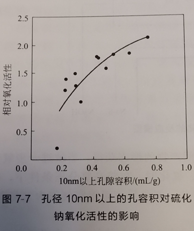 在白液的氧化反应中,催化活性受到活性炭的比表面积、比孔容积、孔径分布等因素的影响。在硫化钠氧化反应中,催化剂活性起着至关重要的作用。该活性炭不受活性炭本身所具有的2nm附近的孔隙所支配,而与对反应成分扩散影响变小的10nm以上的比较大的孔隙有密切关系。活性炭孔径10nm以上的孔容积与反应性能之间的关系如图7-7所示。