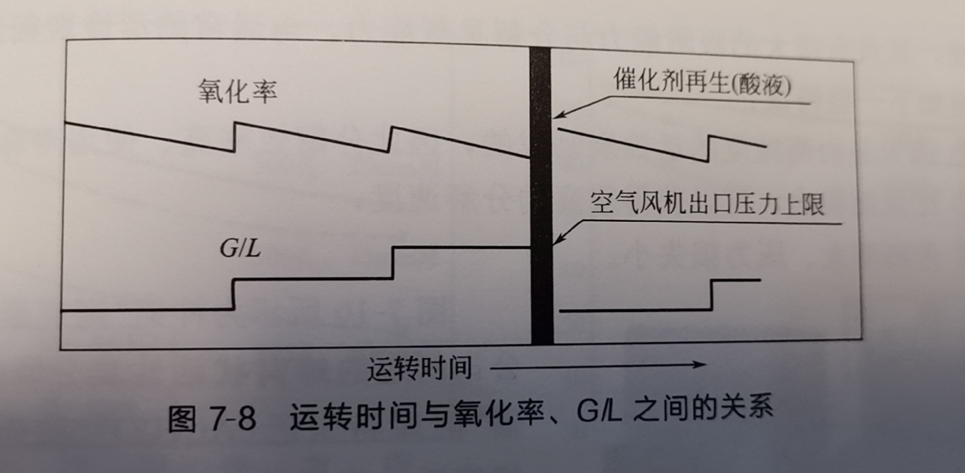 经氧化处理后,过滤器中催化剂的表面上会有固体悬浊物质(SS)附着,白液的氧化率便随着运转时间的增加而逐渐下降。因此,需要对活性炭催化剂进行再生。为了将氧化率保持在50%~70%范围内,增加空气量以提高G/L时,空气鼓风机的出口压力上升,当出口压力达到允许值的上限时,用酸溶解附着在催化剂表面上的固体悬浊物质,进行催化剂的再生。图7-8表示随着运转时间的增加,氧化率与G/L之间的关系。