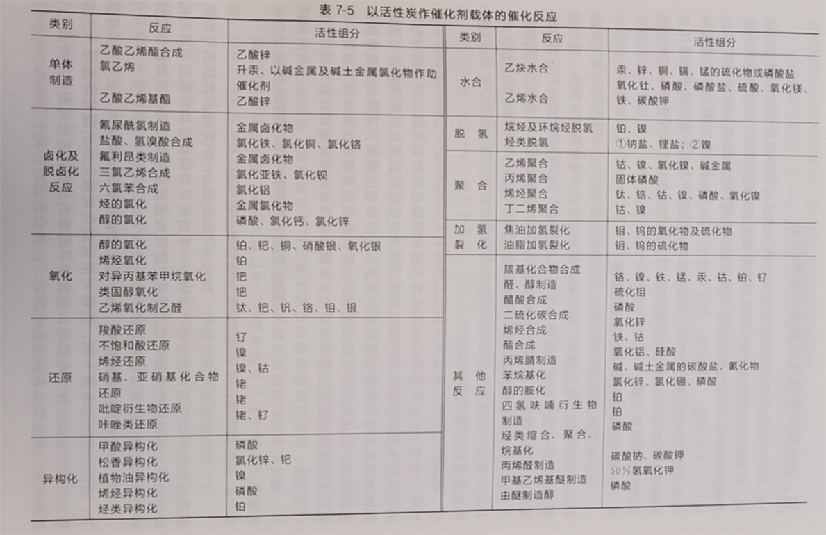 活性炭作为载体有以下优点:价格低廉,耐酸碱度高,性质稳定,孔隙结构发达,比表面积巨大,吸附性能优良。另外,通过炭载体的燃烧,负载在活性炭上的贵金属较易回收,而且催化剂的性质也会受到活性炭的表面积、孔结构及表面官能团的影响,而炭载体的这些参数可以通过物理及化学处理的方法以修饰,使催化剂具有更大的调整和适应范围。因此活性炭作为载体的应用日益广泛。以活性炭作为载体的催化剂催化的反应种类包括:卤化、氧化还原、树脂单体制造、聚合、异构化以及其他各种反应。表7-5所示为活性炭作为催化剂载体的一些催化反应。