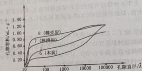 含碳量、挥发分和密度三者要适宜。其适宜性随着含碳量的增加和挥发分的减小而得到改善。原料的密度提高对发展活性炭的孔隙容积是有利的,原料密度大,活性炭微孔容积大,CCl4吸附能力强。木炭的装填密度小,其微孔容积小,CCl4吸附能力差,碘吸附值也低。图1-2中原料密度对活性炭孔隙的影响见表1-3。