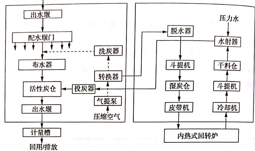 国内某10x104m³/d工业废水处理厂应用了活性炭吸附及就地再生系统,其自动化水平高,运行成本也较低,其活性炭吸附及输送系统工艺流程如图1-2所示。